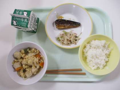今日の給食献立は、ご飯、牛乳、いわしの梅煮、はりはりソテー、厚揚げの錦とじ でした。(お詫び)写真は、ご飯が逆でした。