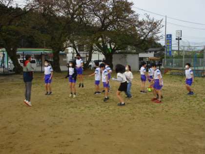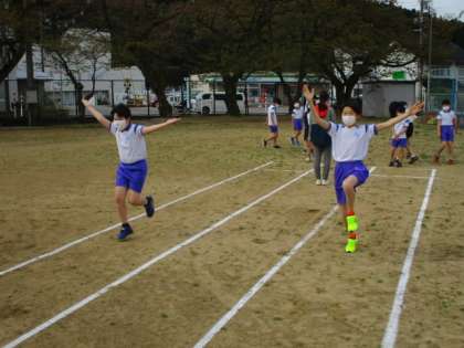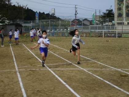 6年生は「走」の順番です。軽い準備運動の後、大きく手を挙げながらの走りに挑戦しました。「グリコのポーズだ」という児童も中にいましたが、手の振りを使えない中での練習です。また、最後には1本だけ「今日のまとめの走り」を行いました。