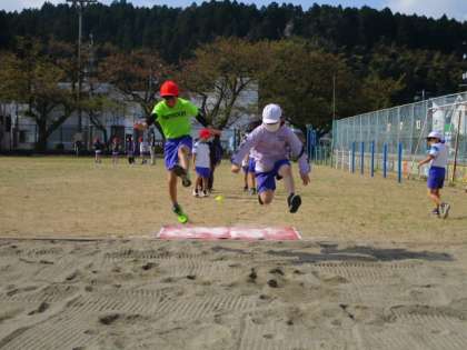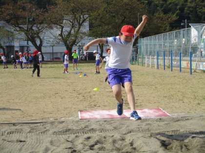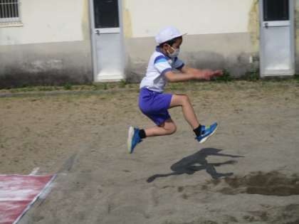 走り幅跳びの難しさに踏み切りを合わせることがありますが、今日の練習ではマットを使い、スピードをつけて大きく跳ぶことに主眼を置いて練習しました。