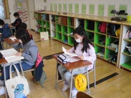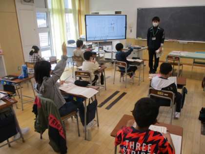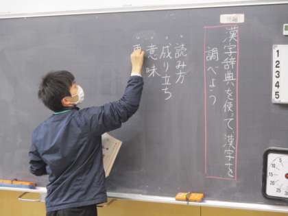 4年生の2時間目は国語の授業でした。「漢字辞典を使って漢字を調べよう」という説明文を読んで学習を進めていきます。授業を見ているたら、担任の先生が「誰か読んでくれる人?」との問いかけたところ、積極的に手を挙げた児童が何人もいて、学級の前向きさを感じることができました。