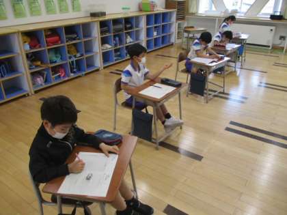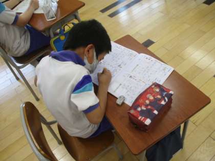 5時間目に3年生教室をのぞくと、2年生の復習に取り組んでいました。漢字の書き取りをしている児童がいたり、100ます計算のかけ算に取り組む児童がいたり、それぞれにこれまでの学習内容を強化していました。