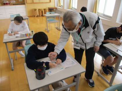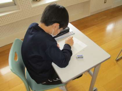 6年生の3時間目は、外国語(英語)の授業でした。教室をのぞいた時には、自分の名前を英語で表し、関連する絵を描いているところでした。