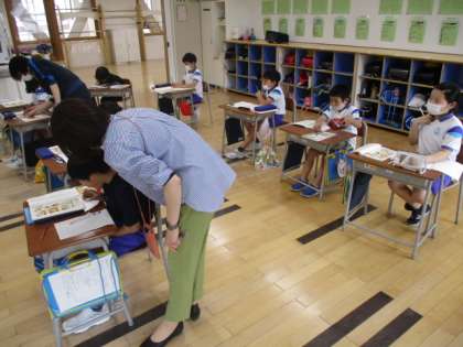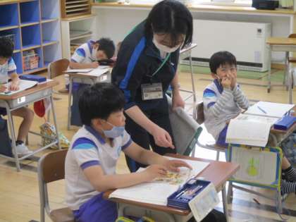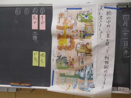 3年生の3時間目は国語の授業でした。教科書に載っている動物園の挿し絵について、絵の中の文字を使って、動物園の様子を表す文作りを行いました。