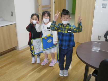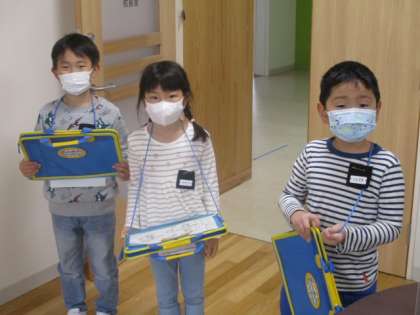 1時間目の1年生は、「がっこうにはなにがあるのか、くわしくさがそう」という学習課題をもって校舎探検に出かけました。3人が1組となり、学校の図面をもって探検開始です。図面には幾つか「×」が付けてあり、その部屋には入れません。何か宝探しの様でワクワクします。活動中のところ、それぞれの班の写真を撮りました。