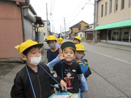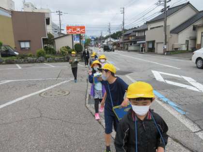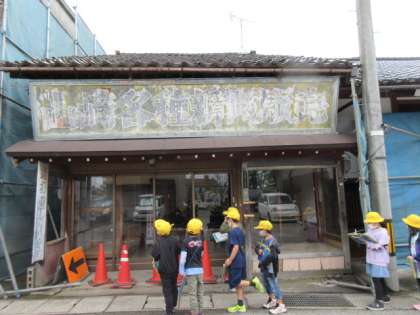 4月22日(金)社会科 上滝小学校のまわりの様子 公開日 2022/04/22 更新日 2022/04/22 3年生 3年生は社会科で、上滝小学校区の土地利用の様子を学習しています。今日は、学校から三室新谷付近まで歩きました。学校の前の道沿いには、公共施設や店が多くありました。帰り道は昔からある道を歩きました。古くからある店に子どもたちは興味津々でした。