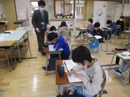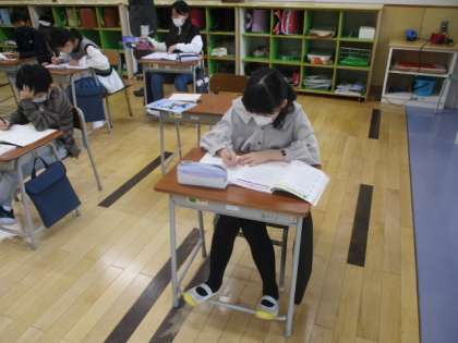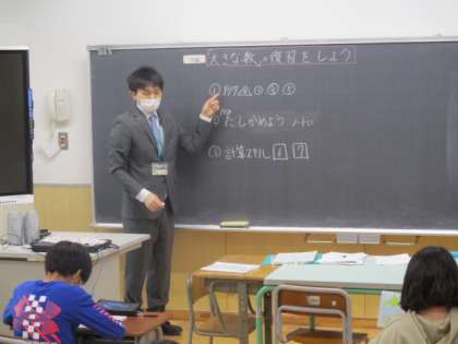 4年生の1時間目は算数の授業でした。学習内容はこれまでの復習です。児童が取り組んでいたのものを見たところ「大きな数」の復習でした。「1兆は1000億の何倍か」とか「5045200000000を漢字で表しましょう」といった問題もありました。大人でも難しさを感じずにはいられませんでした。