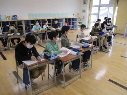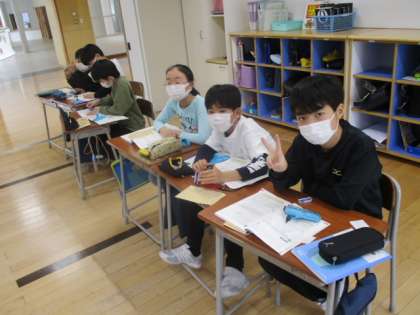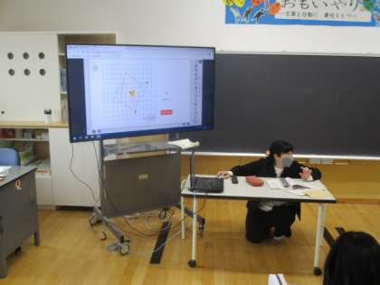 6年生の1時間目は算数の授業でした。学習の内容は図形です。担任の先生がコンピュータの画面を使い平行四辺形を回転していきました。180°回転したところで元の図形に重なりました。図形の新しい見方を学びました。