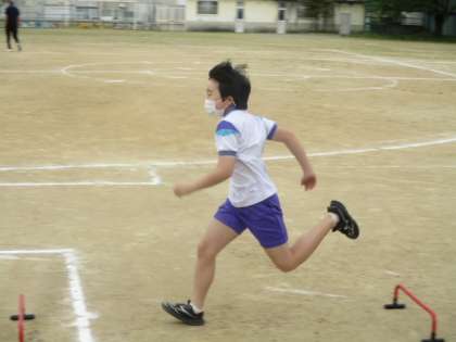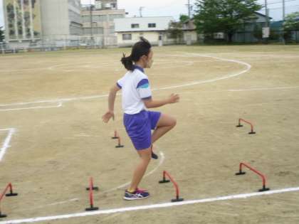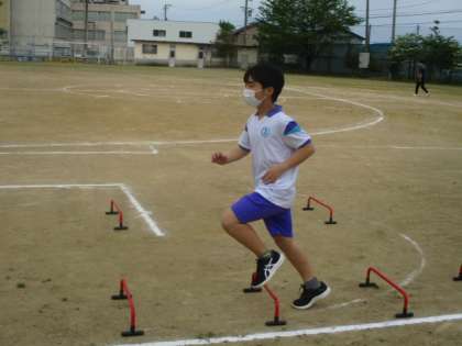 今朝の上学年は、克己タイムを使って50m走の練習をしました。写真は、6年生がラダーを使ってウオーミングアップをしているところです。