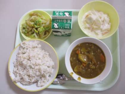 今日の給食献立は、カレーライス(麦ご飯)、牛乳、福神和え、フルーツヨーグルトでした。