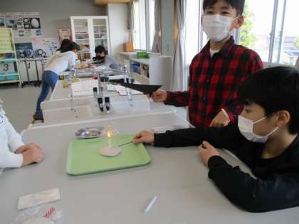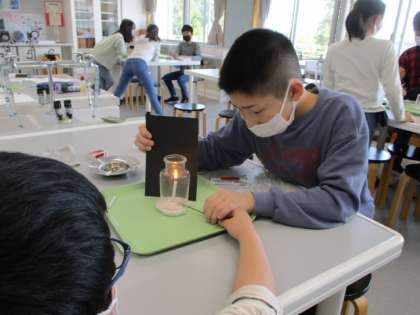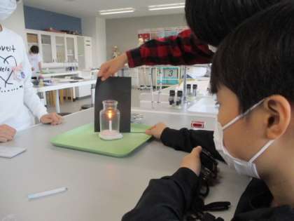 いよいよ実験に取りかかりました。その結果、ろうそくが燃え続けるためには少しでもすき間をあけ、「通り穴」(空気の出入りする道)を確保することが必要だということが分かりました。
