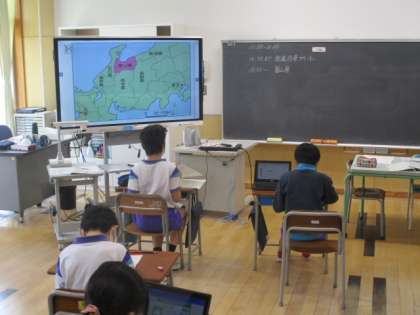 4年生の3時間目は社会の授業でした。都道府県の名前を覚えることが課題でしたが、クラウド教材を使って一問一答で答えていく児童がいたり、難しい漢字もあるけどプリントで書いていく児童もいたり、様々な方法で覚えていました。