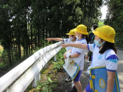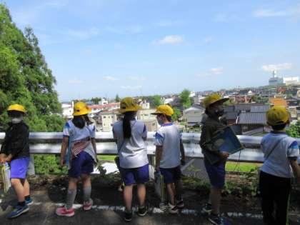 山の中腹で、上滝小学校やまちの様子を眺める子供たちです。