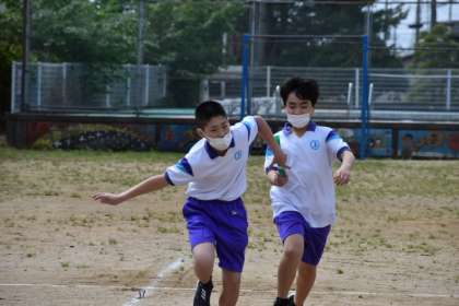 6年生がリレーの練習をしているところです。バトンタッチの練習は、念入りに行いました。