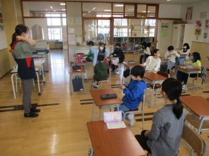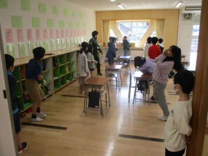 写真は上から、4年生、5年生、6年生の様子です。ちなみに、4年生は「表情伝言ゲーム」をしていました。
