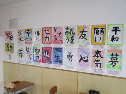5年生教室をのぞくと、とてもカラフルな掲示物がありました。「心のもよう」という作品だそうで、児童一人一人の個性が表れていました。