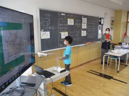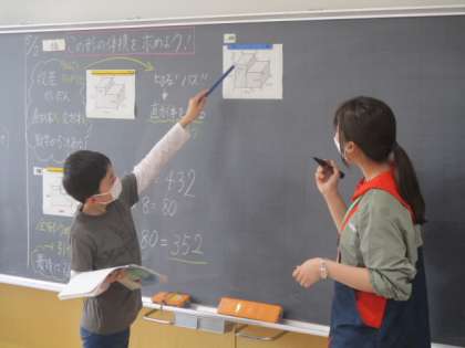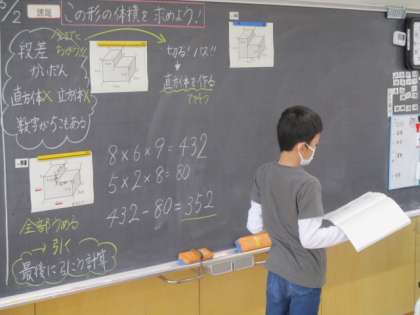 子供たちが体積の求め方で意見交換を行っている際、問題には出てこない「11」という「キーワード」を発言した児童が1人いました。その児童の方法を使うと、8×11×4 という1つの式だけで体積が求まるといいます。とても素晴らしい発想を見ることができてみんなの良い勉強になりました。