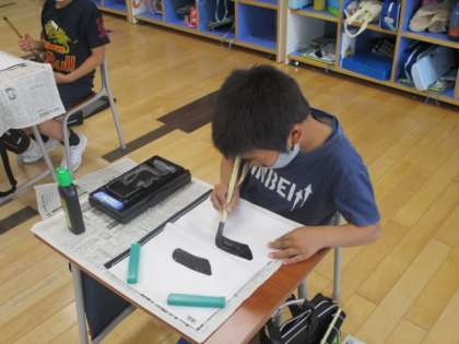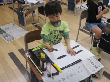 「しずくちゃん」を意識して、早速「二」の文字に挑戦です。今日のところは、用紙の下にお手本を敷いての練習です。うまくかけたでしょうか。