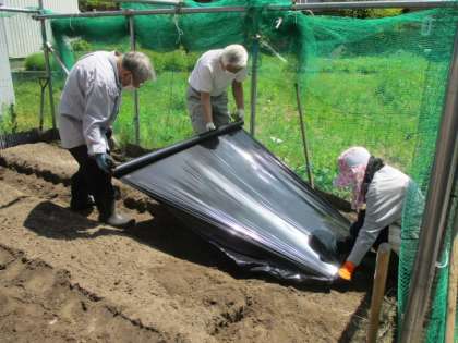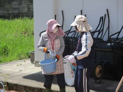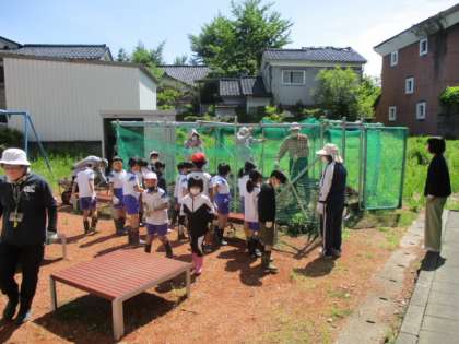 2年生は2時間目に、地域のボランティアさんの協力をいただき、夏野菜を育てる畑のうねを作ってもらいました。