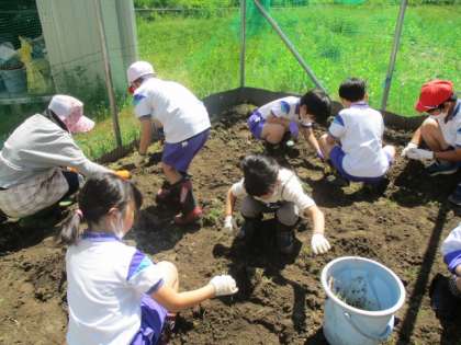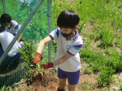 まずは2年児童が畑に入り、草むしりからスタートしました。大物を取りたい気持ちから、周囲にある大きな雑草も取ってくれました。