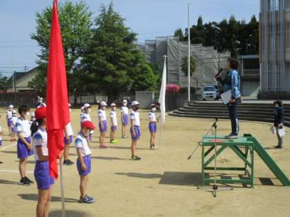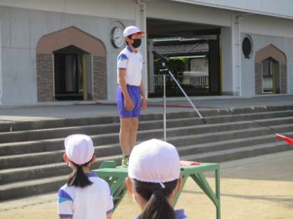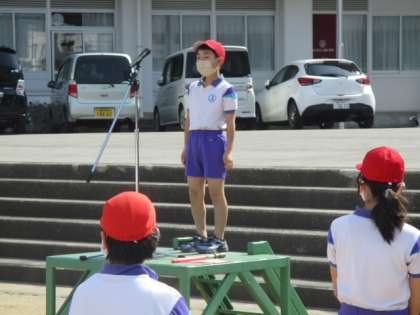 教頭先生の開会宣言です。また開会式では、赤白各団の団長からの言葉があります。それぞれの団の意識を高めるため、心に響く話を期待しています!