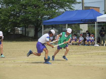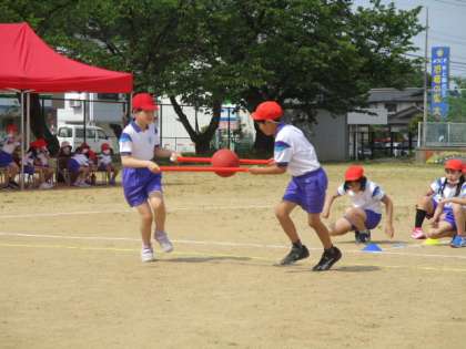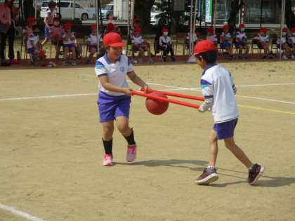 3、4年生の団体競技は「息を合わせてボール運び」です。2人で2本の棒を使ってボールを運ぶリレー形式のレースです。2人の「息」が何より大切です。