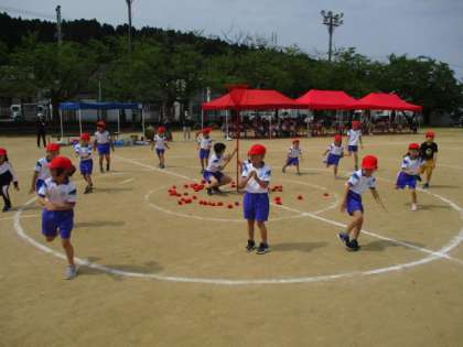 1,2年生の団体競技は、「『やってみよう!』(ダンス&玉入れ)」です。これは、WANIMAの「やってみよう」に合わせてダンスをし、その途中で1年生、2年生の順に玉入れをするものです。2つの学年の合計個数が多い方が勝ちです。