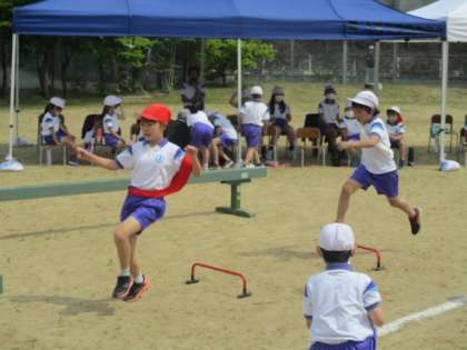 5、6年生の団体競技は「走って跳んで!上滝マリオブラザーズ」という競技です。これは、ご存じマリオブラザーズの世界観の中で行う障害物レースです。障害の中身が分からないと運動会当日に見ていて混乱しますので、写真を使ってルールを少し説明します。