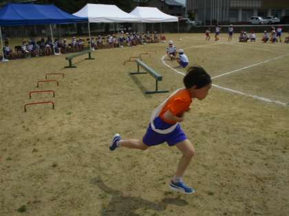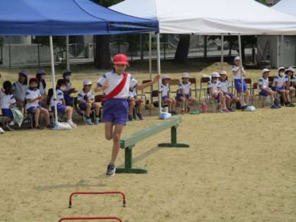 まず、1人が走るのはトラック半周です。スタートすると第1の障害があります。平均台とミニハードルエリアです。コースは右でも左でもどちらでもいいのですが、両方の障害を通過しなくてはいけません。