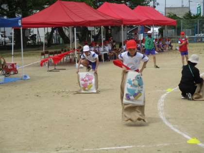 ここで次の走者にタスキを渡します。次の走者は、写真の様に袋に入り、ピョンピョン跳びはねて先に進みます。ここでは袋についたイラストに注目です。何とヨッシーです。
