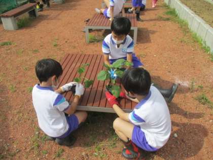 座学の後はいよいよ畑へ向かいます。それぞれが植える「種」や「苗」を持っているので「やる気」を強く感じているようです。