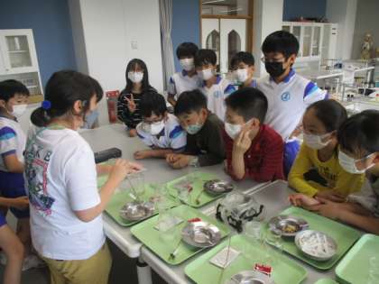 写真上 : まずは実験の予想を立てます。予想はみんなに発表です。