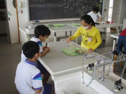 3時間目の6年生は、理科室で実験に取り組みました。今日の実験は、火によって酸素がどう変化するのかを考える実験です。