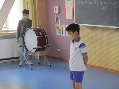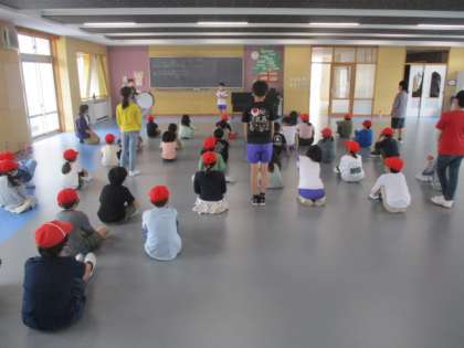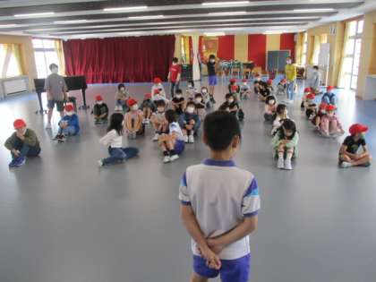 今日のチャレンジタイムは、団毎の活動でした。赤団はみんなの広場に集合して、応援の練習をしました。6年生たちが中心になって指示を出しています。