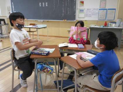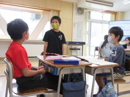 3年生は国語で、話す・聞く学習をしています。すきなものやその理由をノートにまとめます。3人グループになってスピーチし、聞き手が質問をしています。なごやかに話したり、聞いたりすることができました。「ぼくのすきなものは上滝小学校です・・・」と話す子どものスピーチを聞いて、心があたたかくなりました。