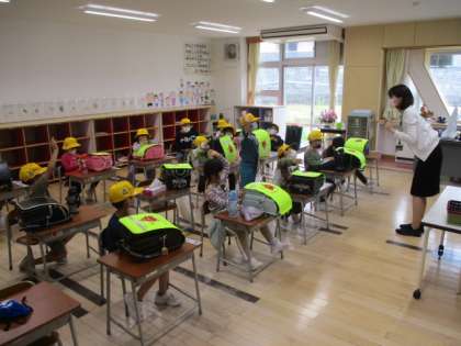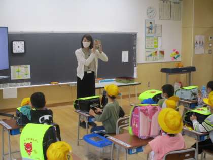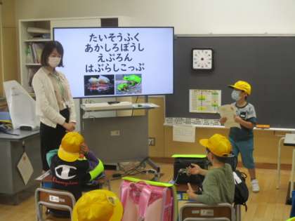 教室を訪れた時、既に帰りの会が始まっていました。日直さんはマニュアルを参考にして進行をしているようです。教室のモニターには、大きな字で持ち物が示されています。きっと連絡帳に書いた後だったのでしょう。日直さんが「先生のお話です」と伝えると、先生は1冊の本を見せて「これは誰の本ですか?」と尋ねましたが心当たりのある児童はいませんでした。そこで「じゃあ、どうすればいいのでしょうか?」との問いかけに、たくさんの児童が手を挙げました。