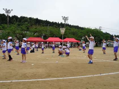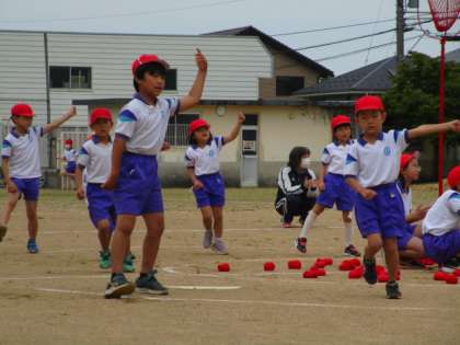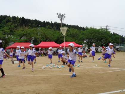 1,2年生の団体競技は、「『やってみよう!』(ダンス&玉入れ)」です。かわいいダンスの後に玉入れで勝負します。