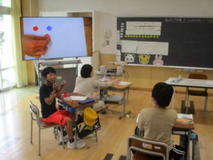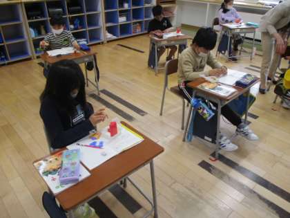 3年生の3時間目は算数の授業でした。今日取り組んだのは、「クッキーが12個あります。3人で同じ数ずつ分けると、1人分は何こになりますか」という問題です。この授業では、具体的な操作をイメージするためにおはじきを使いました。