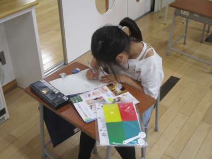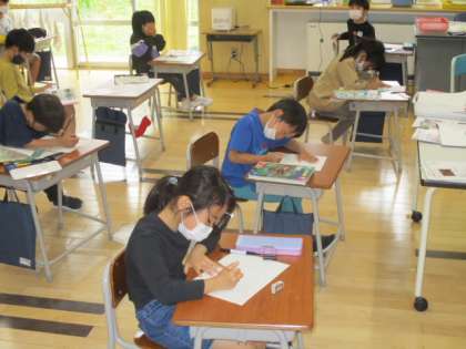 2年生の3時間目は図画工作の授業でした。「ひかりのプレゼントを作ろう」という学習課題で、プラスチックでできた透明なうちわに絵を描いていきます。今日はその下書きをデザインしているところでした。