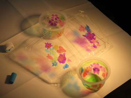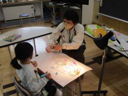3時間目のひまわり級は、図画工作の授業でした。以前にお伝えした「ひかりのプレゼント」の作品づくりの続きです。今日は理科室から強力なライトを持ってきたので、すごく幻想的にな雰囲気になりました。