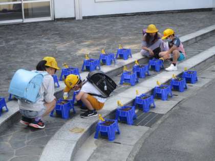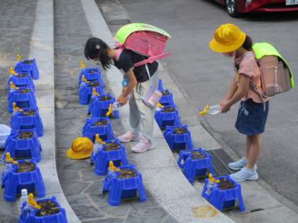 1年生が植えたほとんどのアサガオに芽が出てきました。子供たちは登校して直ぐに、「アサガオさん、はやくおおきくなあれ」という思いを込めて、毎日の水やりをしています。これからしばらくは雨の予報がないので、きっとアサガオさんも喜んでいることでしょう。