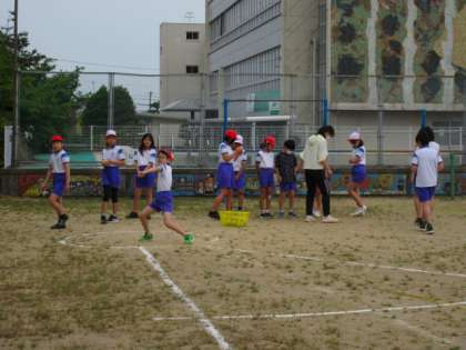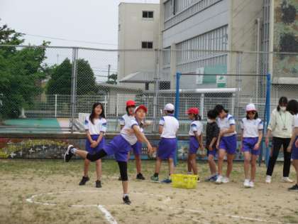 ソフトボール投げと、走り幅跳びの記録をとっています。練習の成果を発揮しようと、一生懸命に取り組んでいます。