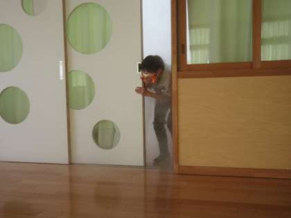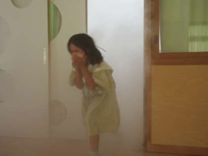 BFCバッジ授与式で、煙中体験を行いました。火災で煙が充満し、全く周りが見えないときは、姿勢を低くし、手で壁をさわりながら逃げることを教えていただきました。写真は、煙が充満した教室の中から出てきた様子です。教室の中は真っ白で何も見えませんでした。