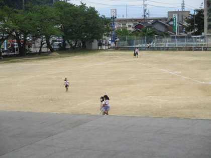 写真上 : グラウンドに飛び出し、元気に体を動かす児童たちです。