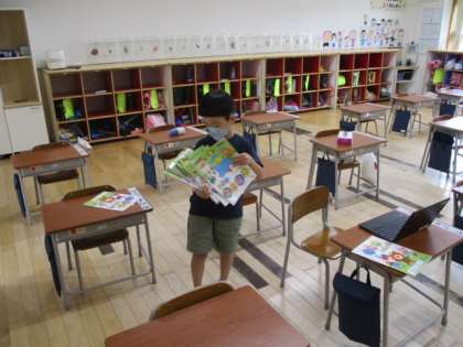 写真下 : 1年生教室では、男児が配りものをしていました。