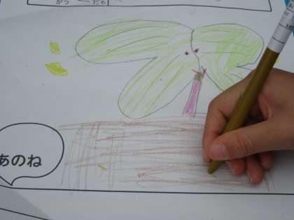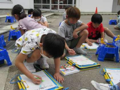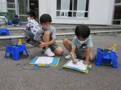 全員のアサガオが発芽したので、芽の観察を行いました。目で見て、色の違いや葉脈を捉えたり、葉を触って感触を確かめたりしました。自発的に、「においも確かめたい」といった子供たちは、アサガオから甘い香りがすることを発見しました。子供によって「あめのにおい」「クリームみたい」など捉え方は様々で、子供たちの感性には驚かされました。