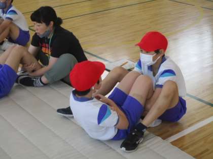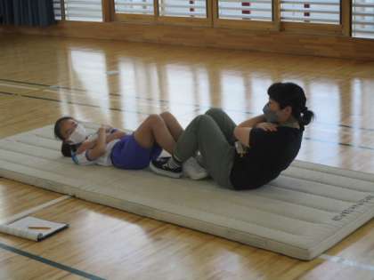 6年生も、体育館を使って「さわやか体育」でした。6年生が取り組んだのは腹筋です。決められた時間内に何回腹筋ができたかが問われます。担任の先生もみんなと一緒に挑戦です。頑張ってくださいね。