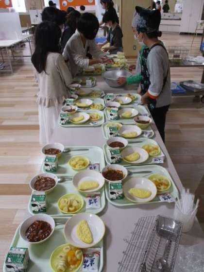 5年生の盛りつけが終わりました。そろそろみんなが取りに来始めます。