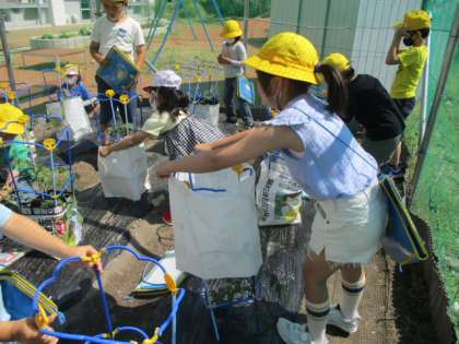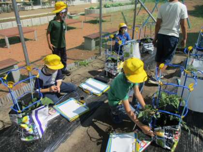 野菜の苗もかなり大きくなってきたことから、今日は風よけのビニールを取ってあげました。これでたくさん太陽に当たるようになります。