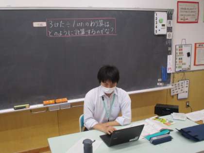 4年生は2時間目の時間帯に、クロームブックを使って算数の勉強をしました。学習した内容は「(3けた)÷(1けた)のわり算は、どのように計算するのかな?」というもので、各自がクロームブック上の操作を行い、分からないところは担任の先生に質問をしていました。