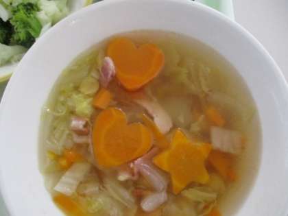 ところで、今日の給食には調理員さんたちの遊び心が入っていました。それというのも、ひよこ豆のスープに入っているニンジンが、星形やハート型に切ってあったのです。3枚目の写真にあるように、星形やハート型が3つも入っていたラッキーな児童もいました。